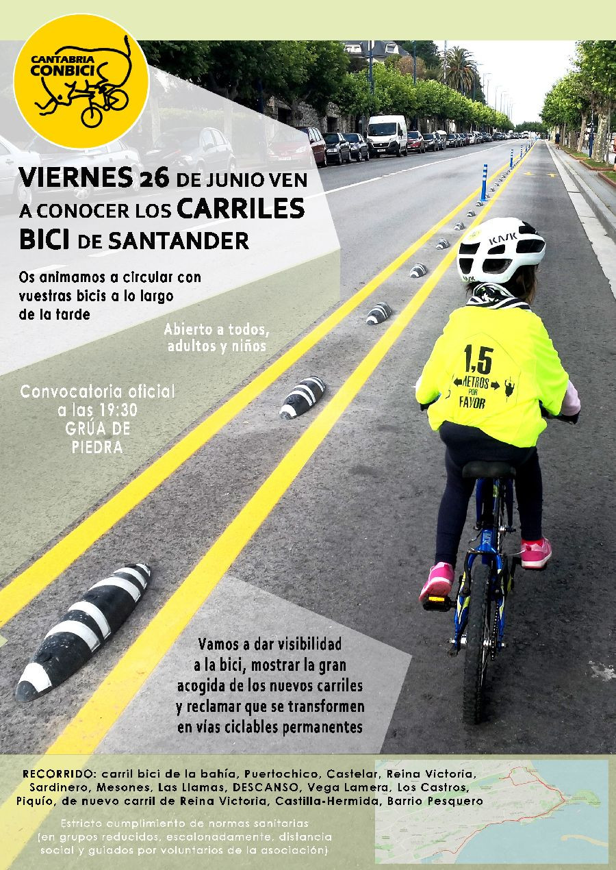 Cantabria ConBici ha animado a sumarse a este paseo "de manera ordenada y con estricto cumplimiento de las normas y recomendaciones sanitarias", para lo que se formarán grupos pequeños de ciclistas, que saldrán de forma escalonada guardando la distancia necesaria y que serán guiados por monitores voluntarios.