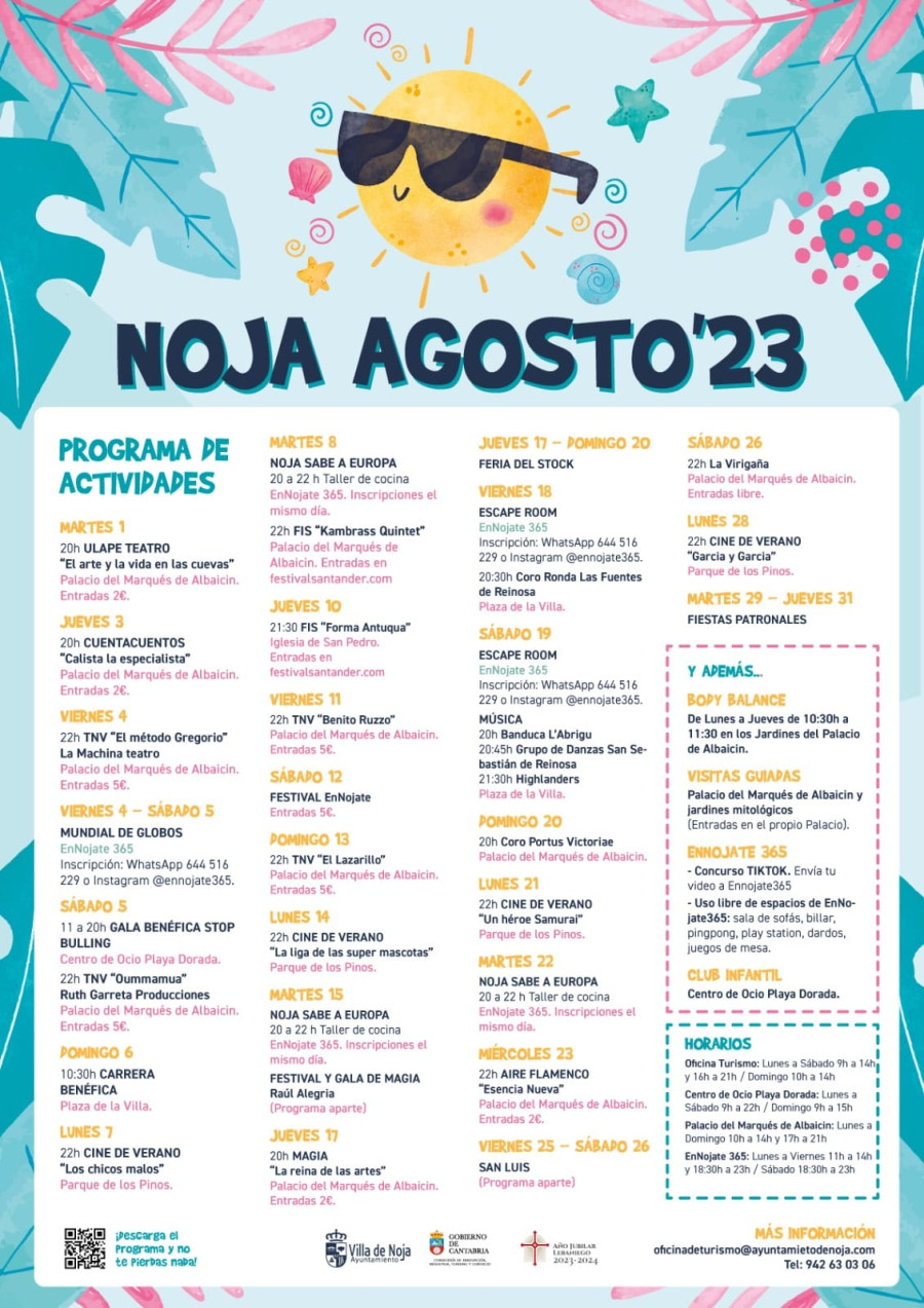 El Ayuntamiento de Noja ofrece este mes de agosto una amplia oferta de ocio y cultura entre la que sobresale la música, el cine al aire libre y el teatro así como eventos como el festival de magia, la feria de stock, una nueva edición de la Carrera Solidaria y una gala benéfica en contra del bulling, entre otras actividades.